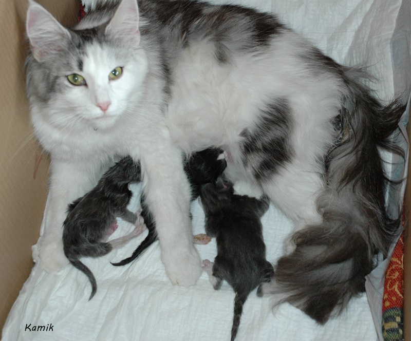 31-05-201531 maja 2015 przyszły na świat pierwsze dzieci Nili i Engela. Urodziły się cztery kocięta: dwie dziewczynki i dwóch chłopców. Pierwsza dziewczynka to Orina czarna (być może będzie dymna) z białym. Urodziła się jako pierwsza z wagą urodzeniową 120g. Drugi na świat przyszedł chłopiec o imieniu Odin niebieski (srebrzysty) pręgowany klasycznie z białym z wagą urodzeniową 130g. Następna to dziewczynka o imieniu Ofra niebieska z białym z wagą urodzeniową 110g. Niestety Ofra odeszła po trzech dniach za TM. Ostatni urodził się chłopiec o imieniu Orion czarny (srebrzysty) pręgowany klasycznie z białym. Pierwotnie miał mieć na imię Obelix ;-)